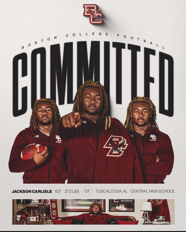 My name is Jackson Carlisle, and I am a Division I football scholarship athlete at Boston College, originally from Tuscaloosa, Alabama. I attended Central High School in Tuscaloosa, where I competed as a defensive lineman in one of Alabama’s most competitive high school football programs. Playing at Central helped shape my work ethic, toughness, and disciplined approach to the game. I balanced academics and athletics throughout high school, which allowed me to graduate ahead of schedule and enroll early at Boston College. Becoming an early enrollee gave me the opportunity to begin training and competing at the collegiate level sooner, and it reflects the level of accountability and preparation I bring to everything I do. I come from a very supportive family that has played a major role in my development on and off the field, and I attend and actively participate in church, which helps guide my values, character, and commitment to serving others. Giving back to my community has always